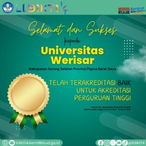 Lembaga Layanan Pendidikan Tinggi (LLDIKTI) Wilayah XIV Sulawesi dengan bangga mengucapkan selamat kepada Universitas Werisar atas pencapaian akreditasi baik dari Badan Akreditasi Nasional Perguruan Tinggi (BAN-PT). Prestasi ini merupakan bukti nyata komitmen Universitas Werisar dalam meningkatkan kualitas pendidikan tinggi di Indonesia.